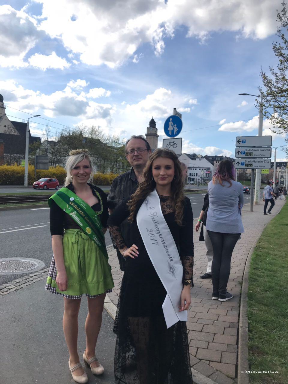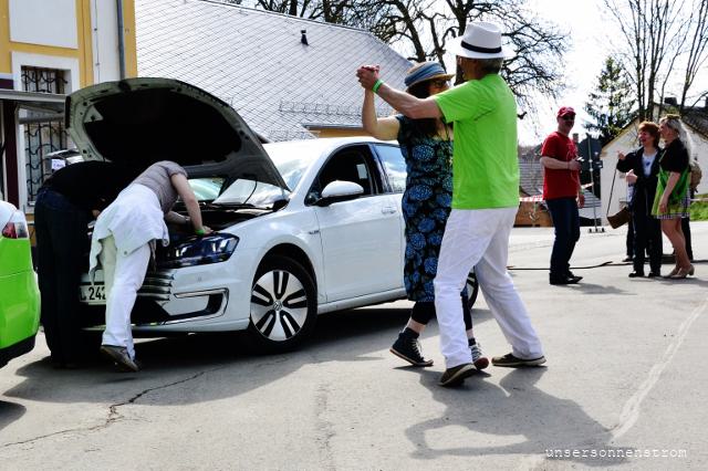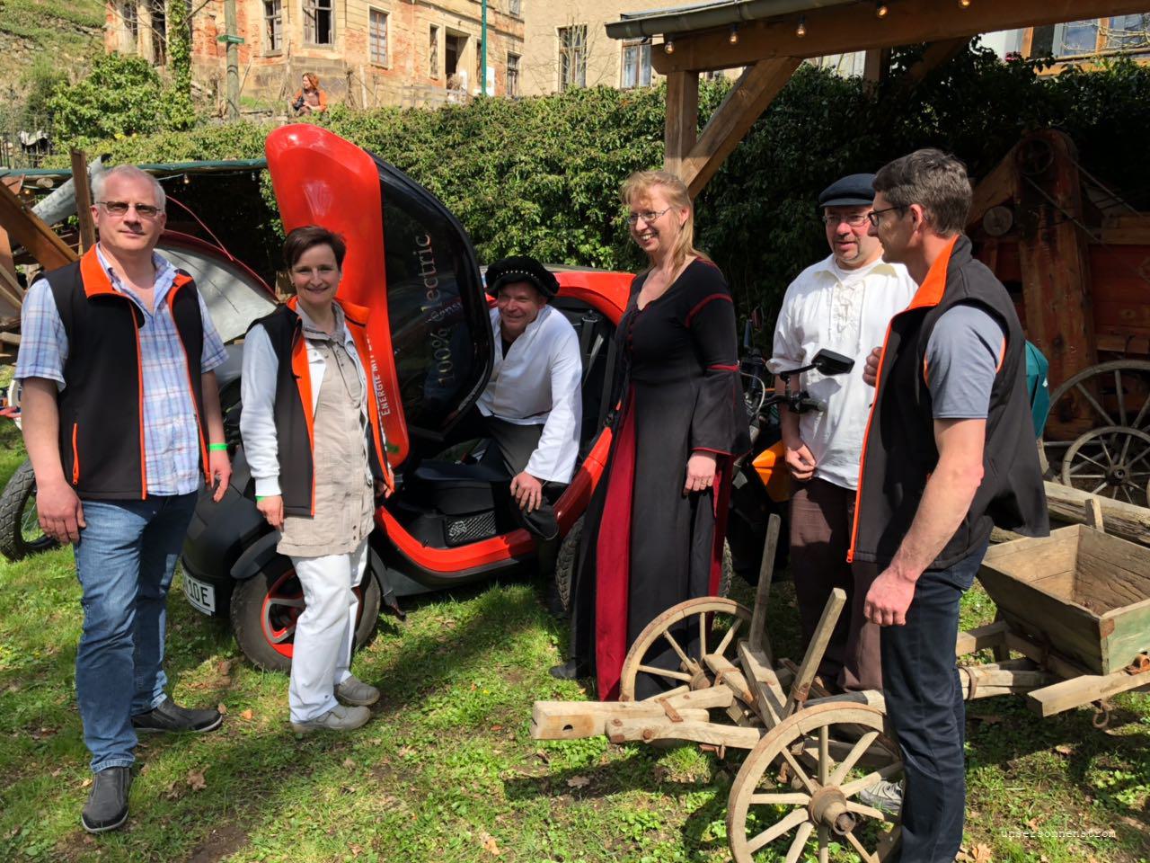 Mit meinen Ideen und Telefonaten noch nicht am Ende rief ich im Schloss Leubnitz an. Ein herzliches Gespräch folgte mit Frau Klebert, von den Freunden des Leubnitzer Schlosses e.V. Sie konterte dann gleich mit dem anstehenden Frühlingsfest am Schloss, und somit wurden wir Bestandteil mit unserer Tour am Wertungsstützpunkt Leubnitz. Frau Klebert, Herr Witt und Herr Ficker unterstützten uns bei der Vorbereitung inklusive Ladestandort für mindestens 12 Fahrzeuge, die während der Tour das Stromangebot dankend annahmen. „Halt, hier fehlt noch was!“ Wer soll denn hier stempeln? Nicht weit entfernt von Leubnitz liegt Rodau und aus einem Bericht zur Grünen Woche in Berlin erfuhr ich von der Ernteprinzessin, die dort „residiert“. Auch sie, Dominique Hörkner, war gleich bereit, sich zum Frühlingsfest in Leubnitz zum Abstempeln der Kärtchen zur Verfügung zu stellen. Als Dank wartete auf sie eine Etappenfahrt nach Plauen mit dem Tesla von Familie Janbeck. So empfing sie, zusammen mit dem Herrn von Kospoth die 50 Fahrzeuge. Übrigens kam unser Pedelec-Fahrer Jan Hermann stets im Mittelfeld der Elektrofahrzeuge an. Klasse Leistung!