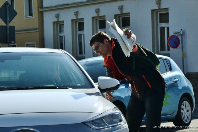 Die sonnige Fahrt gestaltete sich kurzweilig und mit ein paar Fahrzeugen zusammen, Peer und Daniela im Saic Maxus EV80 Transporter, Ralf und Franziska im Renault Zoe, Stefan und Jennifer im Opel AmperaE, erreichten wir den Neustadtplatz in Plauen. Die Spitzenprinzessin, Barbara Riss empfing jeden Teilnehmer mit einem Foto durch Sina Löhnert und Stempel. Auf dem Platz fanden sich ein paar Interesierte, denen die Fahrer Fragen zur alltäglichen Anwendung beantworteten und auch manche Probefahrt zuließen. Herr Pöllmann vom Förderverein Komturhof Plauen e.V. sprang kurzfristig ein, um den Gästen ein kleines Stück Plauen näher zu bringen. Er berichtete über das Schloss und begleitete die Teilnehmer ins Konventgebäude. Ich hoffe, auch Herrn Pöllmann konnten hier ein paar Fragen zum Elektromobilität beantwortet werden. Hier in Plauen hätten wir uns etwas mehr Bereitschaft von Seiten der Stadt gewünscht, aber vielleicht habe ich da nicht den richtigen Weg gewählt und / oder den Angesprochenen hat die Phantasie gefehlt.