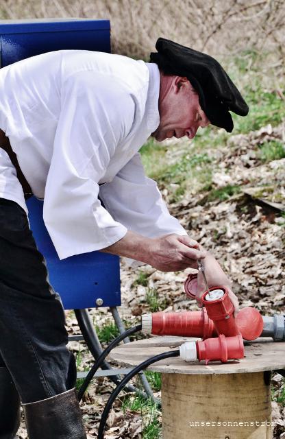Weiter ging es mit Telefonieren für die Tour. Auf dem Plan stand für mich die Burgruine Liebau. Nach etwas Internetrecherche fand ich „De Gockeschen“ und mit Jörg Reinhardt und Anne Schwegler geriet ich an die richtigen zwei. Mit ihrer Vereinsarbeit machten sie unseren 3. Stempelort zu einem urigen Mittagspäuschen im Grünen. Neben den essenden Gästen tuckerten alte Maschinen zu mancher Verwunderung unserer Gäste. Aber, wer uns kennt weiß, dass wir Alt und Neu gern verbinden. Und unsere vergangene Technik gehört da einfach dazu. Gefühlt alle Mitstreiter im Verein waren auf den Beinen um uns die gute alte Zeit inklusive der Burgruine nahe zu bringen.