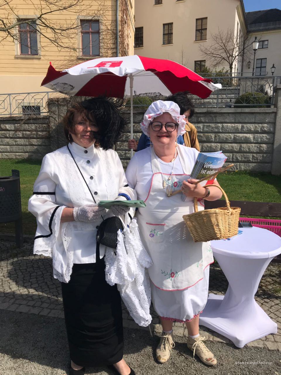 Dasselbe passierte mir auch im Museum des Unteren Schloss Greiz. Die Mitarbeiterinnen hatten sofort ihre eigenen Ideen, wie sie sich am Etappenpunkt in Greiz einbringen wollten. Der Antrag auf die Durchfahrt in der Stadt an der Alten Wache vorbei wurde uns aber nicht genehmigt. Es fehlte die Veranstaltungsversicherung, die wir eigentlich als Privatorganisatoren nicht unbedingt abschließen wollten. Die Stadt kam uns da leider mit eigenen Ideen nicht entgegen. Somit leiteten wir dann am Samstag alle 50 Fahrzeuge auf den Parkplatz Landratsamt und die Teilnehmer stürmten zu Fuß den Rasen vorm Unteren Schloss. Wir wurden begrüßt von Frau Zill, der Freifrau von Groiz Johanna Kühnast sowie Koch- und Backmädel Heidi Körner, die auch das Stempeln übernahmen.
