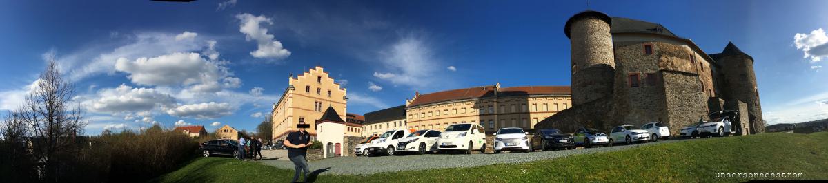 Manche Teilnehmer, die nicht auf dem Schloss geladen haben, brachen dann nach dem Essen zur Heimreise auf. Sie planten vor der Abfahrt eine erste Ladung an den öffentlichen Ladesäulen in der Region, die in solchen Ausnahmefällen, wie so ein Treffen, zu wenig sind. Da musste man dann noch eine kleine Ladeweile z. B. am Schnelllader an der A72 Vogtland Süd einplanen und warten, bis andere fertig sind. Auch ist es sicher ein Fehler der Behörden, die Ladeinfrastruktur auf die regional angemeldeten Fahrzeuge umzurechnen, denn die Fahrzeuge, die zu uns in die Region kommen, müssen ja Laden, um wieder nach Hause zu kommen. Deshalb ist jede Destination wichtig, die erkennt, das eine Lademöglichkeit wichtig ist. Sei es an der eigenen Hauswand, an der Laterne nebenan, oder auch ein Verlängerungskabel zu einem Fenster raus.