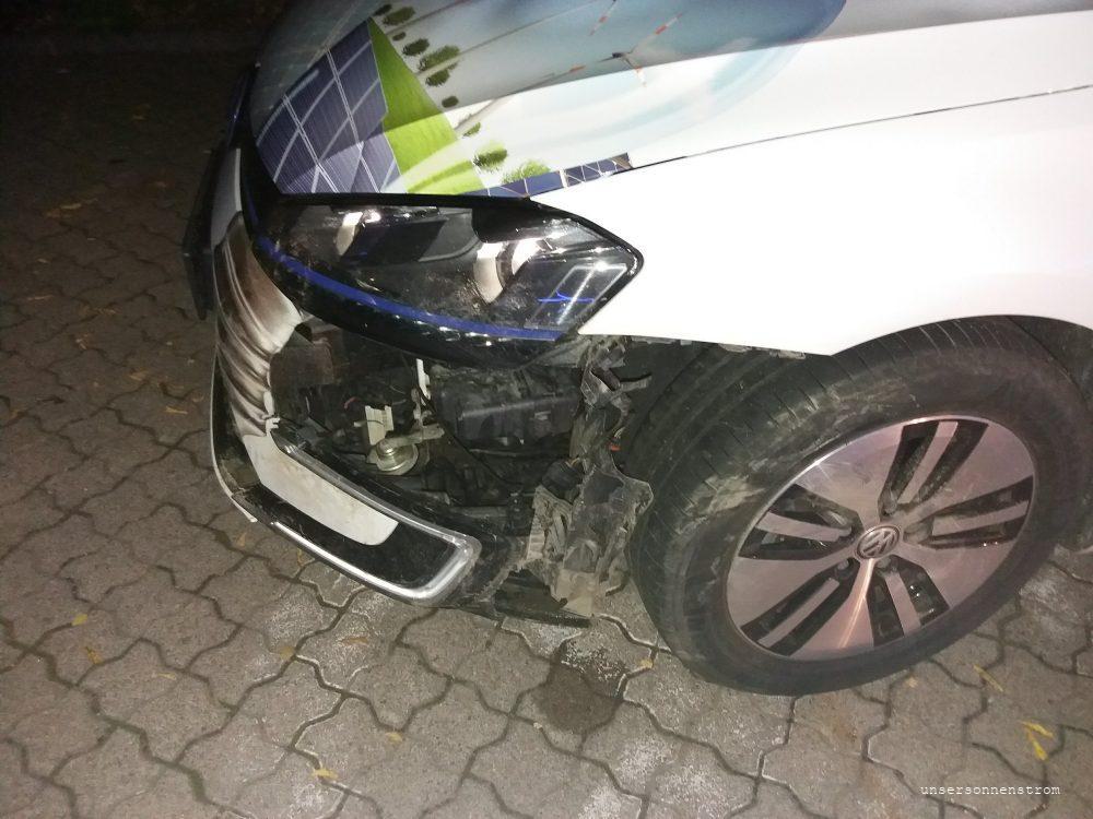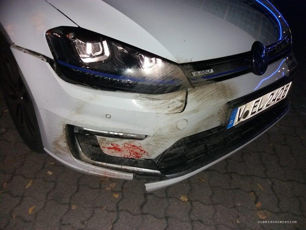So, lang war es geplant. Meine Kur wegen des Asthmas steht an. Die Jungs zu Hause instruiert 😉, die Route mit Ladestationen geplant – oh doch Elektroauto- sorry. Kann los gehen. Weil ich pünktlich mittags in der Klinik auf Usedom ankommen will, fahre ich nachts 1:00 Uhr los. In Chemnitz lade ich den eGolf 20 Minuten bei HEOS und weiter geht’s in Richtung A4. Alles ruhig auf den Straßen, nur wenig Verkehr, mit vollem Akku fahre ich von der A72 auf die rechte Spur zur A4. Plötzlich sehe ich im Scheinwerferlicht zwei Wildschweine, ich bremse, buff, rolle aus… Kann bestimmt gleich weiterfahren, so schlimm war es doch nicht, kein Airbag aufgegangen, puh… Erstmal anhalten, aussteigen… Sch…! Vorn alles kaputt, beide Wildschweine erwischt. Polizei anrufen, Warnweste an, raus aus dem Auto, Warndreieck aufstellen, ich steige hinter die Leitplanke. Zum Glück regnet es nicht. Wo sind die Wilschweine? Es fahren einige Autos an mir vorbei. In ihrem Scheinwerferlicht sehe ich Reste meiner Stoßstange, kein Wildschwein in Sicht. Während der Wartezeit auf die Polizei rufe ich die Versicherung an. Dann rufe ich zu Hause an. Frank, tut mir leid. Die Polizei nimmt den Schaden auf und in dieser Zeit rappelt sich ein Wildschwein wieder auf und erliegt letztendlich auf der dritten Spur auf der Autobahn. Autos fahren darüber und daraufhin warnen die Polizisten mit nochmals extra Licht den kommenden Verkehr, beseitigen unter Lebensgefahr den Kadaver. Ich schaue nochmals den Zustand des eGolfs an und beschließe in Begleitung der Polizei die Autobahn über die nächste Abfahrt zu verlassen. Das geht ohne Probleme; es kommt keine Fehlermedung, der Rest der Stoßstange hält, schon gar nicht brennt das Auto, was einem ja immer wieder propagiert wird bei einem Unfall mit einem Elektroauto. Ich stehe an einer Tankstelle und warte auf Frank, der sich mit Omas Leaf die 80km auf den Weg gemacht hat. So ganz spontan und ungeplant. Geht eben. Frank befestigt notdürftig die noch halbfesten Teile. Mit dem voll geladenen eGolf und dem nicht laden müssendem Leaf fahren wir nach Hause. Wir klären alles, Kur, Versicherung, Autohaus. Wie fahre ich jetzt zur Kur? Einen Leihwagen? So viele Kilometer? 3 Wochen? Verbrenner? Elektroauto? Macht keiner mit. Also nimmt Frank das Leihauto, heute ein Verbrenner, ab morgen einen eGolf, Omi gibt mir den Leaf, Danke dafür. Ich muss die Kur heute antreten, das heißt ich muss los.
