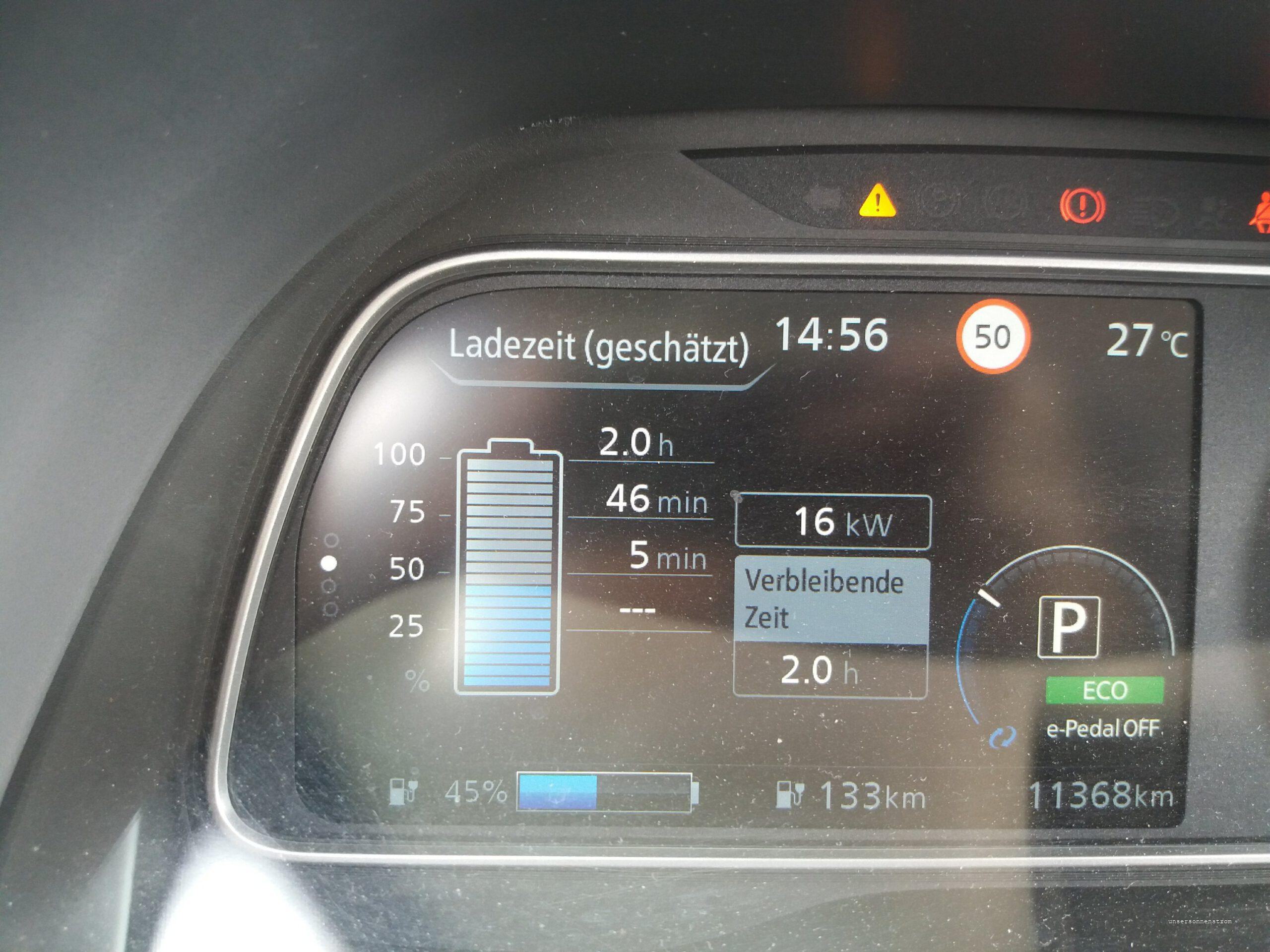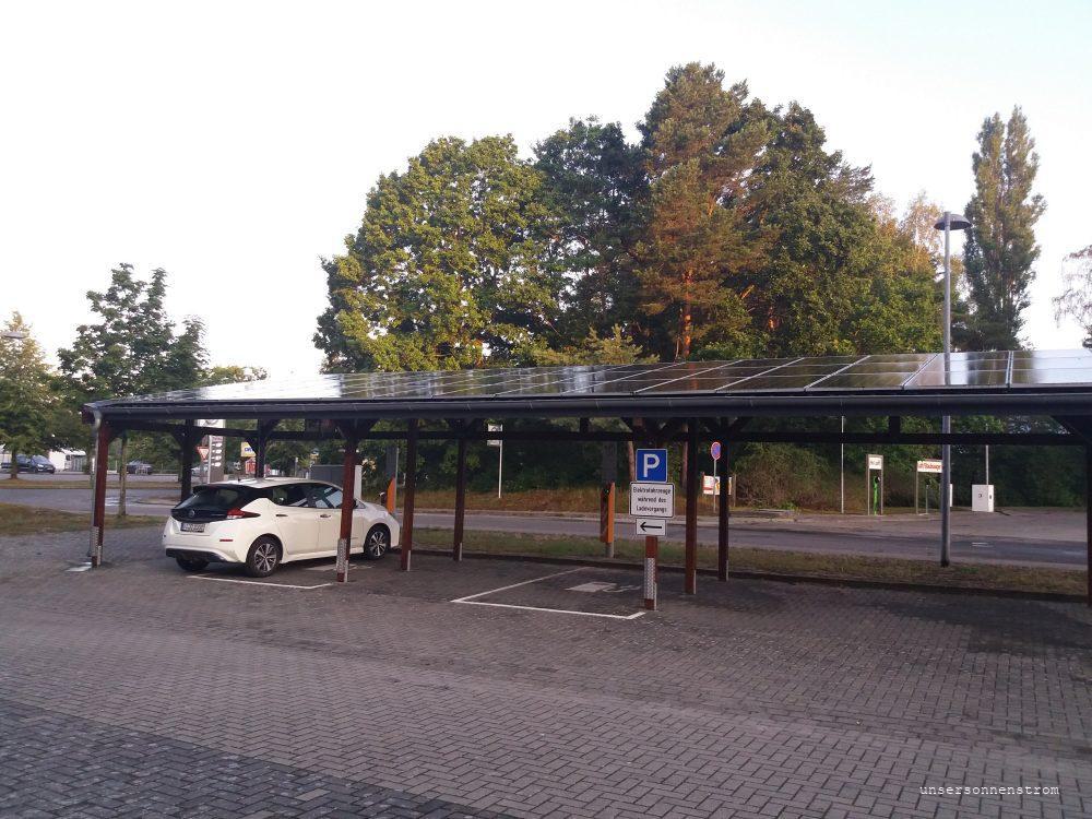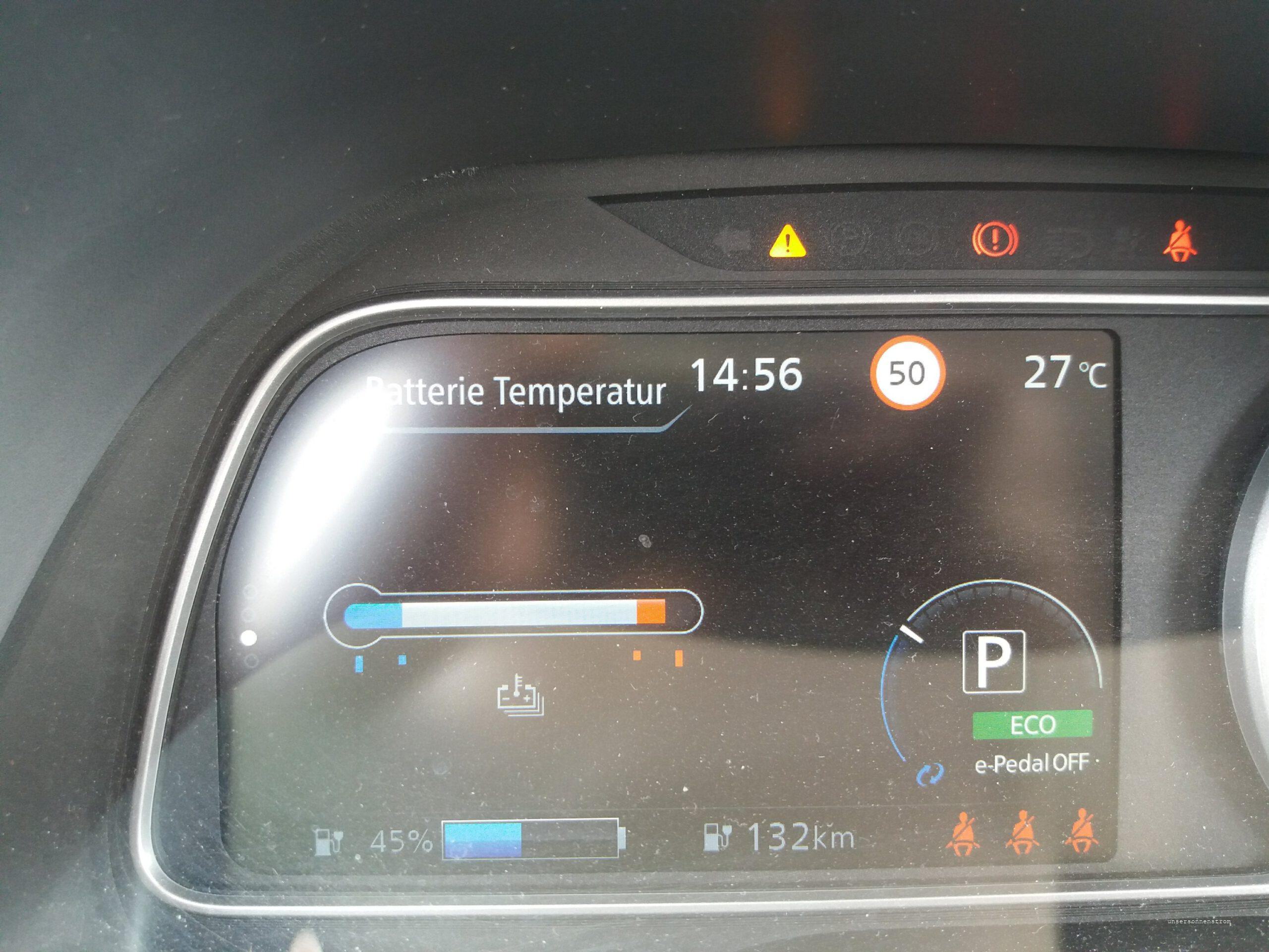 Es ist mittlerweile 10:00 Uhr. Der Leaf muss erst laden. Ich steuere die Allego Ladestation in Treuen an. Lade bis 200 km um bis Thiendorf zu kommen. Ich komme gut voran, die Unfallstelle in Chemnitz passiere ich mit mulmigen Gefühl. Die Straßenmeisterei steht gerade dort. In Thiendorf, 11:50 Uhr angekommen, lade ich gequetscht am Straßenrand an einer viel befahrenen Straße. Es gibt bessere Stellen, aber besser als nichts. Ich lade 46min / 22kWh, ein kleiner Snack und weiter geht’s. Ich schau beim Leaf auf die Temperaturanzeige des Akkus und sie zeigt sich im roten Bereich. Beim eGolf gibt’s da einen analogen Zeiger, aber das dauert, bis der sich von seiner MaxLeistung wegbewegt. Ich befürchte nun den viel gelesenen RapidGate und fahre nicht schneller als 110kmh. Das Außenthermometer steigt teilweise auf 27°C und den Akku stört’s. Knapp unter rot lade ich in Königs Wusterhausen an der HEM Tankstelle und ausgerechnet an dieser ungünstigen Ladeweile entschließt sich nun der Leaf nur mit 16 kWh zu laden😕. Naja, ich komme ja eh zu spät, von daher auch egal. Ich nutze die Gelegenheit die Leute beim Luft aufpumpen zu beobachten. Besser gesagt ich kann mich dem nicht entziehen. Ich bin etwas entsetzt, denn sie kommen mit den Anweisungen der Gerätes nicht zurecht und manchen ist es nicht möglich etwas Luft in den Pneu zu bekommen. Ich male mir aus, wie diese Leute an einer Ladestation stehen… „Elektromobilität funktioniert nicht!“ Nach diesem mehrfachen Amüsement beschließe ich bei einer Reichweite von 200 km, die mir angezeigt wird, bei nicht ganz 75% loszufahren. 160km liegen vor mir bis Pasewalk. Beim Fahren versuche ich die Diverenz zwischen Restreichweite und noch zu fahrenden Kilometern möglicht groß zu halten. Aber es schrumpft dahin. Ich klemme mich hinter einen Laster, nicht ganz im Windschatten, aber er fährt nicht schneller als 100 kmh. Seine orange Rückwand begleitet mich jetzt viele Kilometer. Ich schaffe es innerhalb 2 Stunden in Pasewalk auf dem Markt zu stehen und lade glaube ich 18 kWh „schnell“. Naja, ich brauche nur noch für die letzten 100 km Strom. Somit fahre ich 45 Minuten später von Pasewalk über die Landstraßen nach Usedom. Die Temperatur des Akkus ist wieder kurz unterhalb des roten Bereiches, das Fahren beeinträchtigt es nicht. Wie geplant erreiche ich gegen 20:00 Uhr die Klinik. Der Leaf bekommt einen „Schlaf“- Ladeplatz unter dem Solarcarport der Inselwerke und nein, sonst mache ich das nicht so, aber nach diesem Tag blieb er die ganze Nacht dort stehen. Nach 22 Stunden – Gute Nacht.