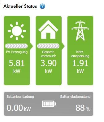 Dieses Fahrprofil haben wir nicht jeden Monat, wir sind ja keine reisenden Vertreter. Wir laden viel zu Hause und da ist es nach wie vor unser Anspruch bei Tag zu laden. Und da ja immer irgend ein Elektroauto vor der Tür steht, lädt halt auch immer eins. Momentan kommen über die PV 5,8 kW rein, es lädt der eGolf mit 3,6 kWh, der Hausspeicher ist zu 88% gefüllt, ist immernoch was übrig. Kommt ’ne Wolke, ist der Speicher der Puffer.