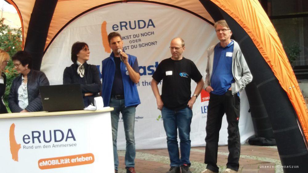Nachmittag fuhren wir nach Weilheim, dem Fahrerlager der eRUDA, wo sich alle Teilnehmer mit ihren Fahrzeugen trafen. Mittlerweile ist die Verschiedenheit der Fahrzeuge so groß, dass man eine gute Auswahl zum Kauf eines Elekrtoautos hat. Man kann Prioritäten setzen, Reichweite, Komfort, Marke alles kann berücksichtigt werden. Nach und nach trudelten alle Bewohner unseres Ferienhauses ein. Mandy und Tobias, die von zu Hause kamen aber später losgefahren sind und Peer und Danielea, die bereits die KulTour nach Schloss Neuschwanstein gefahren sind. Anmelden, Prüfung Alltagstauglichkeit beim Ioniq vom Mandy, erstes Briefing und dann Vorträge von Sono Motors und Otto Schönbach. Tourtagebuch Wir folgtem Ottos Vortrag über seine Fahrt mit dem Twizy ans Nordkap, und er hat uns mitgenommen auf seine Reise mit schönen Bildern und Anekdoten während der Fahrt. Ui! …und so viele Busheisle! Danke Otto, das war einfach Klasse. Die anschließende Ladeparty, übrigens gelungener als die ERUDA-Night am Samstag, verbrachten wir mit Essen, Trinken und guten Gesprächen, die man mit Emobilisten immer hat. Am nächsten Tag, Samstag hieß es zeitig aufstehen. Für uns eigentlich nicht, aber die „alten Hasen“ und die „jungen Wilden“ wollten die Challenge nach Sölden fahren. Mal eben 362km nach Sölden auf 2700m hoch und zurück. Mandy und Tobias haben sich bestimmt wie wir damals am Stilfser Joch gefühlt. Aber diese Erfahrung sollte jeder mal gemacht haben, wie geil das Pässefahren ist. https://unsersonnenstrom.wordpress.com/2015/06/19/4-passe-tag/ War aber auch Stress, die vielen Kilometer, viele Teilnehmer, Touris und Stau. Wir haben einen schönen entspannten Tag in Landsberg verbracht. Vorher besuchten wir noch die Windräder in Fuchstal. Dort erfuhren wir von Herrn Sing die Hürden und die erfolgreiche Überwindung dieser. Die Windräder laufen ohne Getriebeöl! Sie werden bald den überschüssigen Strom, der sonst ins Netz geht , zur Wassererwärmung und zum Speichern nutzen. http://www.ib-sing.de/galleries/buergerwind-fuchstal Ein cooles Projekt. Es mussten nicht viele Bäume gefällt werden, es wurden sogar welche umgesetzt, bei Fledermaus- und Vogelflugzeiten werden sie zeitweise abgeschalten- es wurde an alles gedacht. Sollte sich jeder mal antun, so einen Besuch eines „Spargels in der Landschaft“