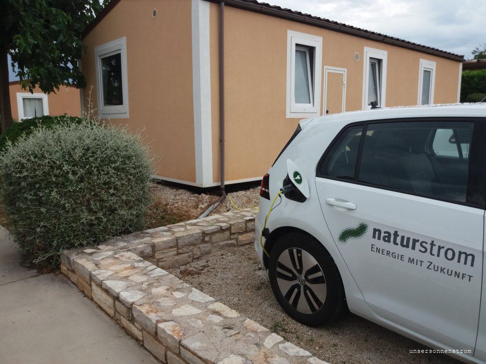 Etwas Geduld war gefragt, bis der Platz neben unserem Bungalow frei wurde. Aber dann, umgeparkt, Kabel gelegt und mit reduzierter Ladeleistung geladen. Kein Campinggast musste ohne Strom sein, nur weil wir unser Auto geladen haben 😉Selbst unterwegs in Kroatien ist es möglich zu Laden. Z.B. Ladekarte kostenlos an der Rezeption ausleihen und fertig.