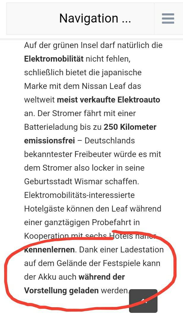 Auf dem Rückweg fuhren wir in Ralswiek vorbei. Da habe ich im Vorfeld von zu Hause aus beim Störtebeker Festival angerufen, weil ich gesehen habe, dass dort eine Ladesäule bei goingelectric.de registriert ist bzw. war. Da stand auch, dass diese während der Vorstellung nicht nutzbar ist, weil ab 17:00 keiner mehr in den Ort fahren darf. Verständlich, da die Parkmöglichkeiten zur Vorstellung begrenzt sind. Auf meine Nachfrage, ob man denn für ladewillige Elektromobilisten eine Ausnahmeregelung schaffen könne und weil der Sponsor Nissan eine Ladung während der Vorstellung explizit auf seiner Website ausschreibt, wurde ich gefragt, „ob ich hier jemanden verarschen will?“