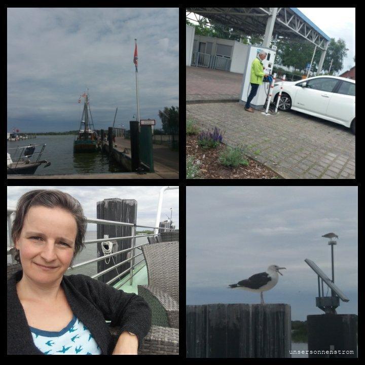 Mal wieder ein Reha-freies Wochende. Auf geht’s zu neuen Ufern. Und zwar runter von der Insel auf’s Festland in den nordöstlichsten Winkel von Deutschland. Ingolf hat mich eingeladen, unser Freund seit Anfang unserer elektromobilen Zeit. In „seinem“ Dorf wurde gefeiert und wir guckten uns den verbrennerlastigen kleinen Umzug an. Dann fuhren wir nach Altwarp. Da steht die wahrscheinlich nordöstlichste Ladesäule. Ein Triplelader mit 20kWh. Daneben 3 Fächer mit Lademöglichkeit für Pedelecs. Ich werde diesen Standort noch im Forum eintragen. Während der Leaf dort lud fuhren wir mit dem Kutter „Lütt Matten“ auf die andere Seite der Bucht nach Neuwarp in Polen. Es setzen dort viele Radfahrer über und erkundeten polnisches Gebiet. Da wir ohne Räder waren war es für uns ein kleiner Spaziergang und dann wieder zurück mit dem Kutter. Auf der anderen Seite wieder angekommen, erstmal ein lecker Fischbrötchen. Und weil das da an dem kleinen Hafen so schön ist, konnte man da auch noch auf dem Fahrgastschiff „Weiße Muschel“ Kaffee und Kuchen genießen. Das Schiff liegt vertäut am Hafen und fährt nicht mehr, aber das Schaukeln an Bord macht einen perfekten Schiffsbesuch aus.