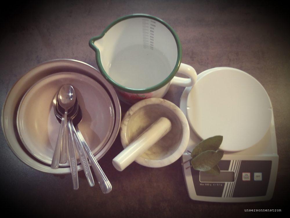 Heute habe ich die Küche auf den Kopf gestellt. Naja eigentlich ist es gar nicht so schlimm. Backen ist bei mir wesentlich schlimmer. Man braucht ja nicht viel um die folgenden Sachen herzustellen. Ein paar Töpfe, Löffel, Messbecher, Waage, Mörser und Zutaten wie Kernseife, Gallseife, Soda, Zitronenseife, Natron, Speisestärke, Kräuter, äth. Öle. In einem gut sortierten DIY-Haushalt findet man all diese Zutaten, weil man sich mit der Zeit immer mehr an die Selbermachvarianten traut. Den Zeitfaktor werden auch viele sehen, aber in einer Stunde ist mehreres gemacht und für manche Dinge braucht man nur Minuten.
