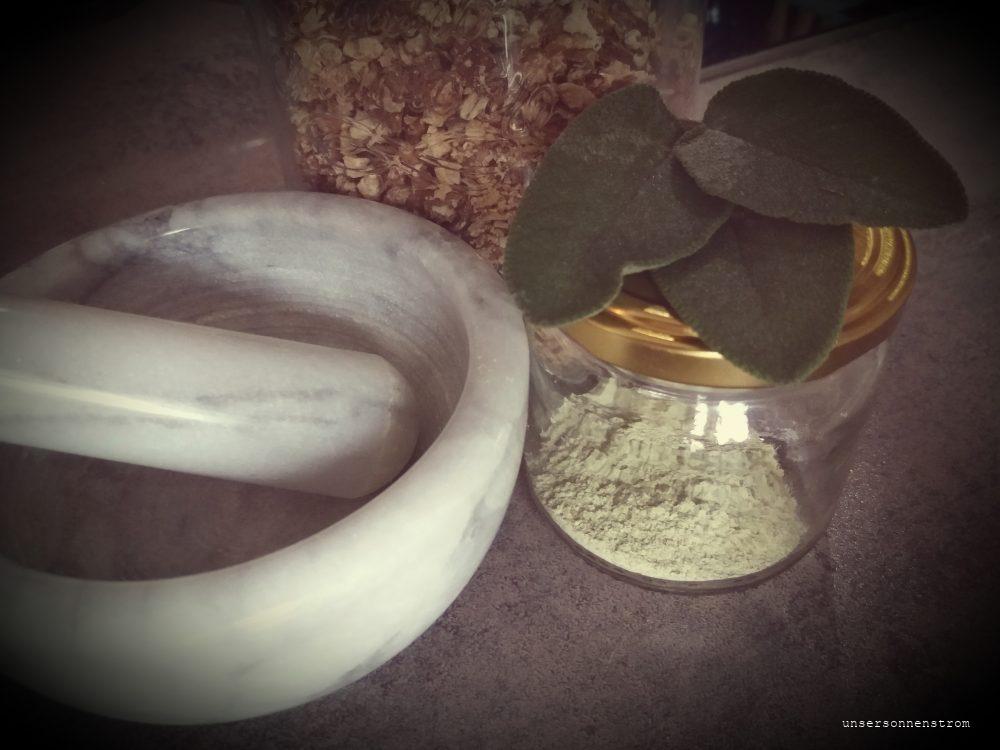 Als erstes habe ich mein Flüssigwaschmittel erneuert. Trotz Efeu und Kastanienschrot habe ich doch gern auch einmal seifiges Waschmittel. Mit Kern-, Gallseife und Soda im Wasser steht es fix auf der Herdplatte. Wird gerührt und aufgekocht…fertig. Für WC-Reiniger mischt man nach Anleitung Zitronensäure, Speisestärke, Spülmittel und Wasser. Dazu ein ätherisches Öl…duftet, desinfiziert passt. Um die Wartezeit bis zum Erkalten der Flüssigkeiten zu verkürzen habe ich noch ein Rezept für Zahnputzpulver ausprobiert. Dafür braucht man Kastanienpulver, Natron und Salbeiblätter. Das war ja einfach. Ob es gut zum Putzen ist werde ich testen. Ihr wisst ja: „Es wird neues ausprobiert, was gut ist bleibt, was doof ist, wird wieder weggelassen oder später nochmal probiert.“