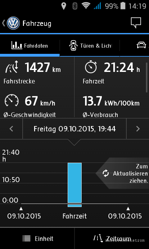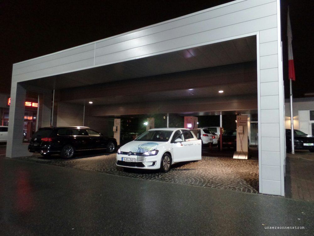 In der Nacht ist es wirklich angenehm zu fahren: weniger LKW und weniger Drängler. Wie immer überlegten wir wieder, ob wir den Ladehalt in Hermsdorf auslassen, aber wir haben ihn besucht. Diesmal funktionierte der Plug Surfing Schlüsselanhänger, genauso wie auch in Schkeuditz, unserem 2. Stopp. Eigentlich sehr Frauenfreundlich… (Essen, trinken, Toilette). Zur Frühstückzeit kamen wir in Magdeburg an einem VW Autohaus an.