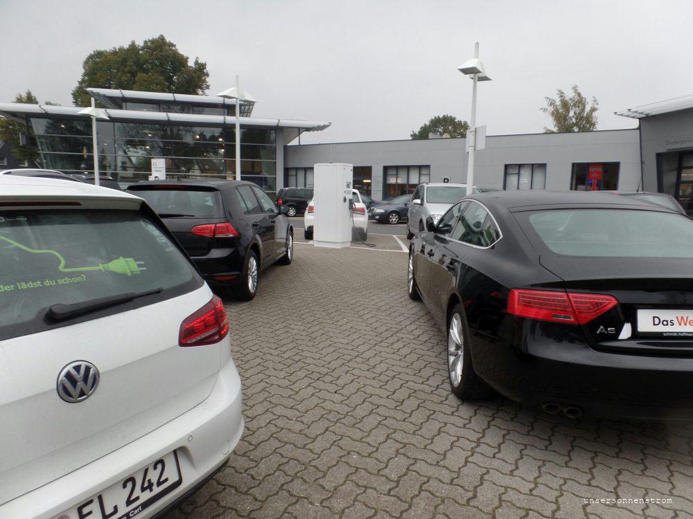 Wir wollten das VW Autohaus in Neumünster zu den Öffnungszeiten erreichen, falls wieder jemand an der Ladesäule parkt. Aber es hat prima geklappt. Wie wir feststellten auch ohne frei zu schalten. 2. Halt in Lüneburg im Parkhaus, diesmal ohne Laubbläser. Mussten wir auch nur die Parkhausgebühr von 1,10€ bezahlen. Nun ging es wieder auf der Landstraße nach Wolfsburg. Das Fahren machte keinen Unterschied für uns, Landstraße oder Autobahn, mit Eco+ 95 km/h. Mit 21 km Restreichweite wollten wir im Techno Forum Laden. Aber weit gefehlt, die Mitarbeiter- Autos wurden dort geladen. An der Schnelllladesäule ein Auto über Nacht zu Laden ist der falsche Plan. Weil man dort innerhalb einer halben max. dreiviertel Stunde fertig ist. Also schnell die App bemüht. 3 km weiter ist ein VW Autohaus und dort konnten wir unter einem Carport mit 50 kW laden.