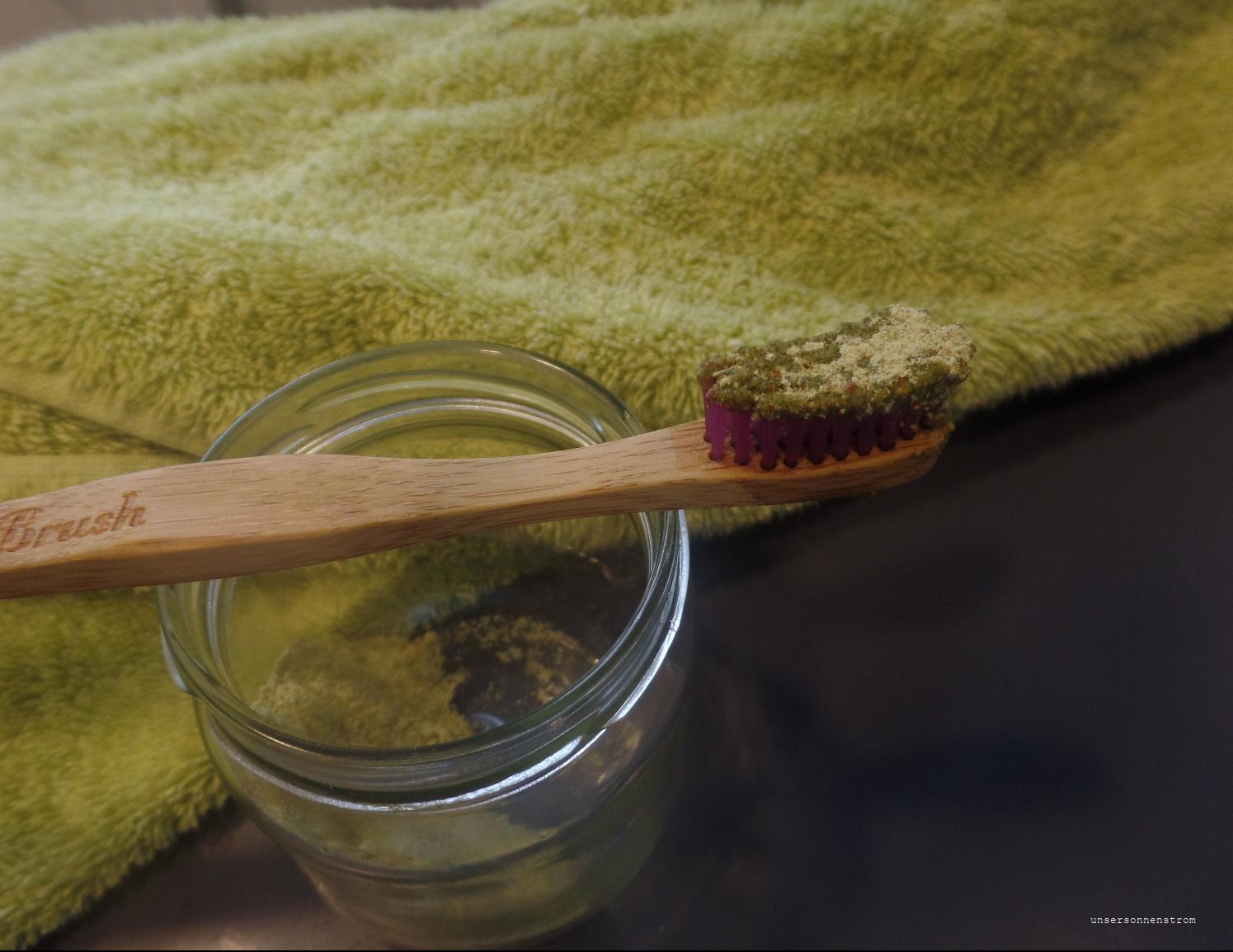 Weiter geht’s mit dem Zähneputzen. Ich habe dieser Tage das Zahnputzpulver hergestellt und wollte euch davon berichten. Erst einmal… es ist grün 😀 Also, es sollte euch möglichst niemand beim Zähneputzen sehen. Es leibt auch im Mund grün und man könnte fast denken man putzt mit Spinat. Der Geschmack ist kräftig nach Salbei und bei weitem nicht so salzig vom Natron wie meine Kokosöl-Zahncreme. Es schäumt nicht, aber das kenne ich schon. Sauber wird sowieso alles, das macht die Zahnbürste. Zahnarzt hat nichts zu bemängeln übrigens.