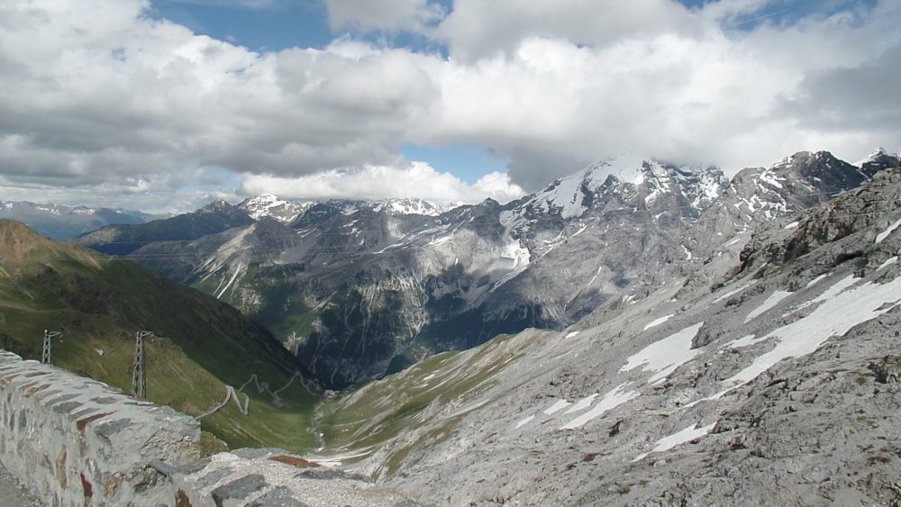 So entschlossen wir uns doch gleich loszufahren. Unser Ziel war Gomagoi über den Ofenpass 2149m und die italienische Grenze. In diesem kleinen Ort durften wir lecker essen und laaaaange Laden. Die 32Amp. Möglichkeiten waren sehr begrenzt und so sammelten sich die Teams, um in den Genuss unserer Gleichstrombox zu kommen. Andere Teams halfen auch, die Wartenden abzuarbeiten. Der Respekt vor dem bevorstehenden Stilfserjochpass war groß und jeder wollte so voll wie es geht geladen sein. Gegen Nachmittag 16:00 war es dann auch für uns soweit. Neben zahlreichen Motorrädern, Fahrrädern und anderen Touristen versuchten wir uns im langsam fahren. Uns fehlt einfach die Erfahrung in einer solchen Berglandschaft zu fahren und zu Rekuperieren. Der Akku war voll und gab unsere gewohnte Reichweite von 190 km an. Das sollte sich schnell ändern. Wir erklommen den Berg in 47 Kurven. Oben angekommen hatte es 8 Grad und herrlichen Sonnenschein.