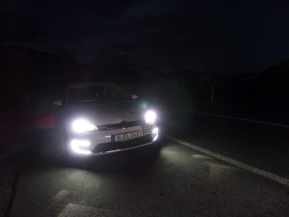 Irgendwie waren wir wieder viel zu spät dran. Das lange Helfen beim Ladechaos in Gomagoi hat uns arg zurück geworfen. Jetzt war es auch egal. Wir starteten bereits im Dunkeln zu unserem letzten Pass. Gemütlich fuhren wir noch mit wenigen letzten Elektroautos über den Berninapass 2328m. Am Pass oben angekommen trafen wir noch die Radler, die bei 4,5 Grad die Abfahrt machen wollten. Einem haben wir noch eins unserer Sweatshirts gegeben.