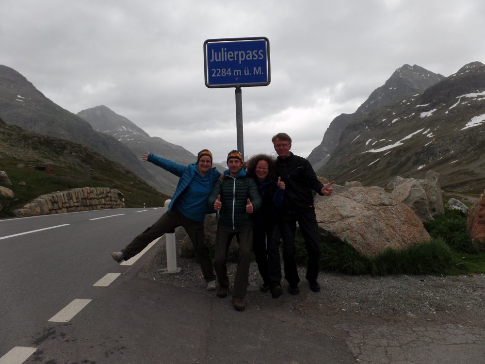Die letzte Etappe stand an. Wir verbrachten den Rest der Nacht in der Lobby und das war sehr kurz. Nach einem guten Frühstück machten wir uns zusammen mit Team Janbeck auf den Weg. Wir mussten wieder über den Julierpass. Oben angekommen, haben wir wieder ein Murmeltier über die Straße laufen sehen. Es wollte aber nicht fotografiert werden. Wenigstens wir vier sind ja zu sehen.