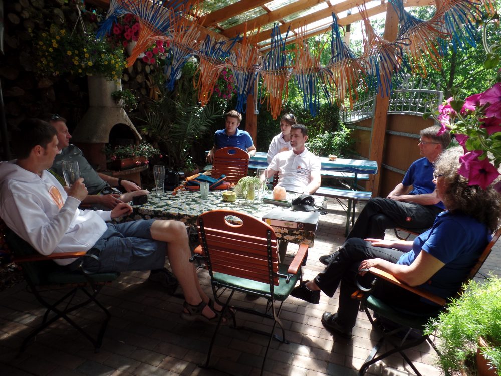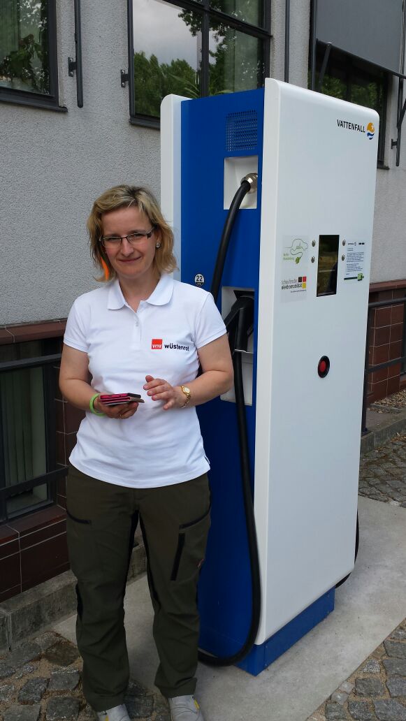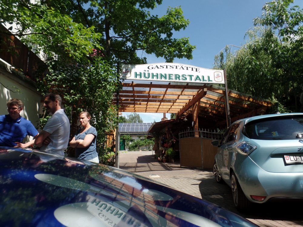 Da heute früh kein Frühstück geplant war, haben wir das zu MC verlegt. Da waren wir schon gut aus der Stadt Leipzig raus und konnten unsere Tour zum nächsten Treffpunkt angehen. Leider war sie mit Umleitungen übersät. Aber auch unasphaltierte, noch in Bau befindliche Straßen konnten uns nicht abschrecken, auf Kurs zu bleiben. In Lutherstadt Wittenberg an den Stadtwerken waren schon andere dabei zu laden, doch leider nur 2 Ladepunkte. Wir halfen erst einmal einem anderen Team, bevor plötzlich nichts mehr ging. Auch nach Telefonaten und neuer Freischaltung bekamen wir dann keinen Strom mehr. Die anderen gestellten Ladeplätze waren schon voll. Somit sind wir zu einer privaten Lademöglichkeit gefahren. Zum „Hühnerstall“, dort gibt es alles was das erneuerbare Energien Herz begehrt. Das war total urig und wir verweilten den ganzen Mittag.
