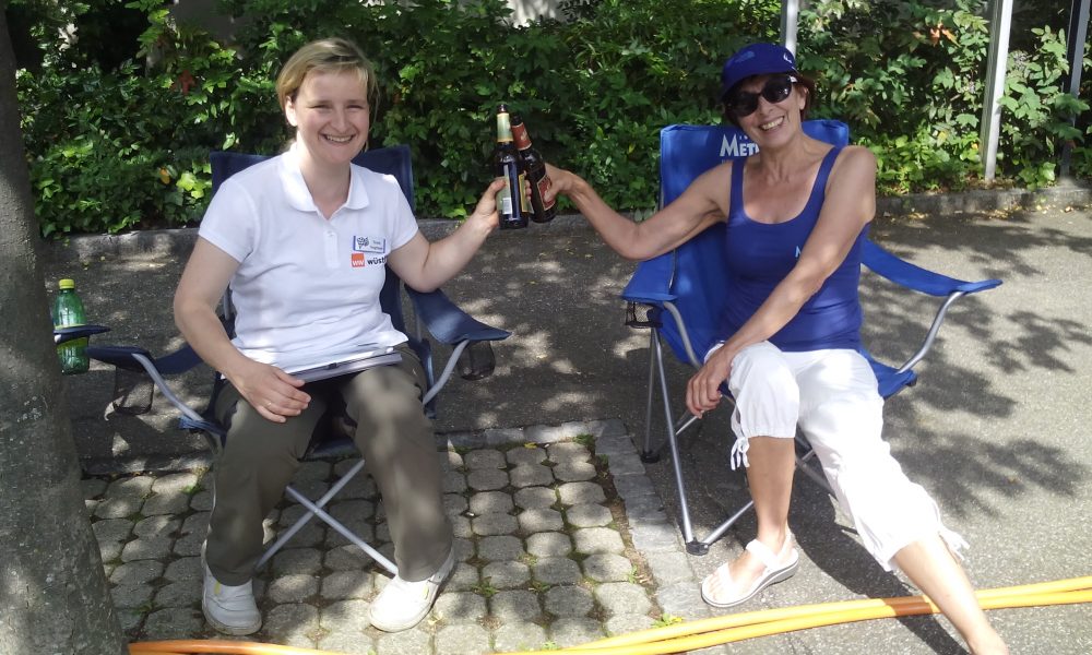 Auf dem Brown Boveri Platz angekommen, haben wir jetzt noch etwas Zeit. Ich schreibe, Frank macht die Streckenplanung. Endlich auch wieder Zeit mit anderen Wave Teilnehmern zu reden.