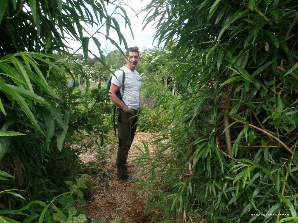 Frank war inmitten der Permakultur gut aufgehoben und wir aßen Salat, wie frisch auf der Wiese gepflückt und tranken Indischen Tee und Zitronenwasser mit Minze. Alex Holzmeier, der Organisator der 1. Solartankstelle Niedersachsen hatte für heute das 25 jährige Jubiläum ausgerichtet und da waren wir natürlich gern gesehen. Vielen Dank für dieses tolle Erlebnis.
